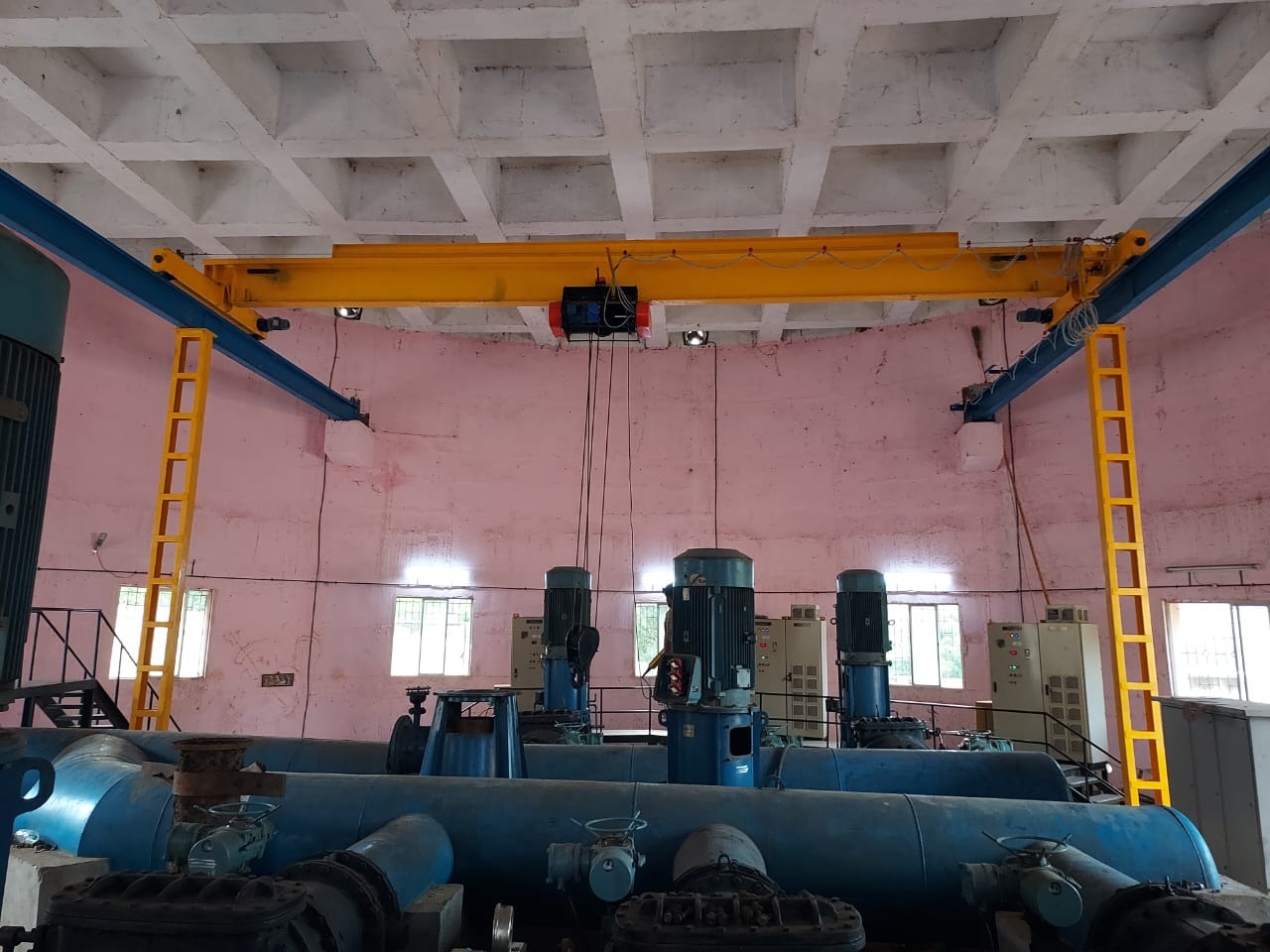 EOT crane assembled in pump house, dams etc to lift motor for maintenance